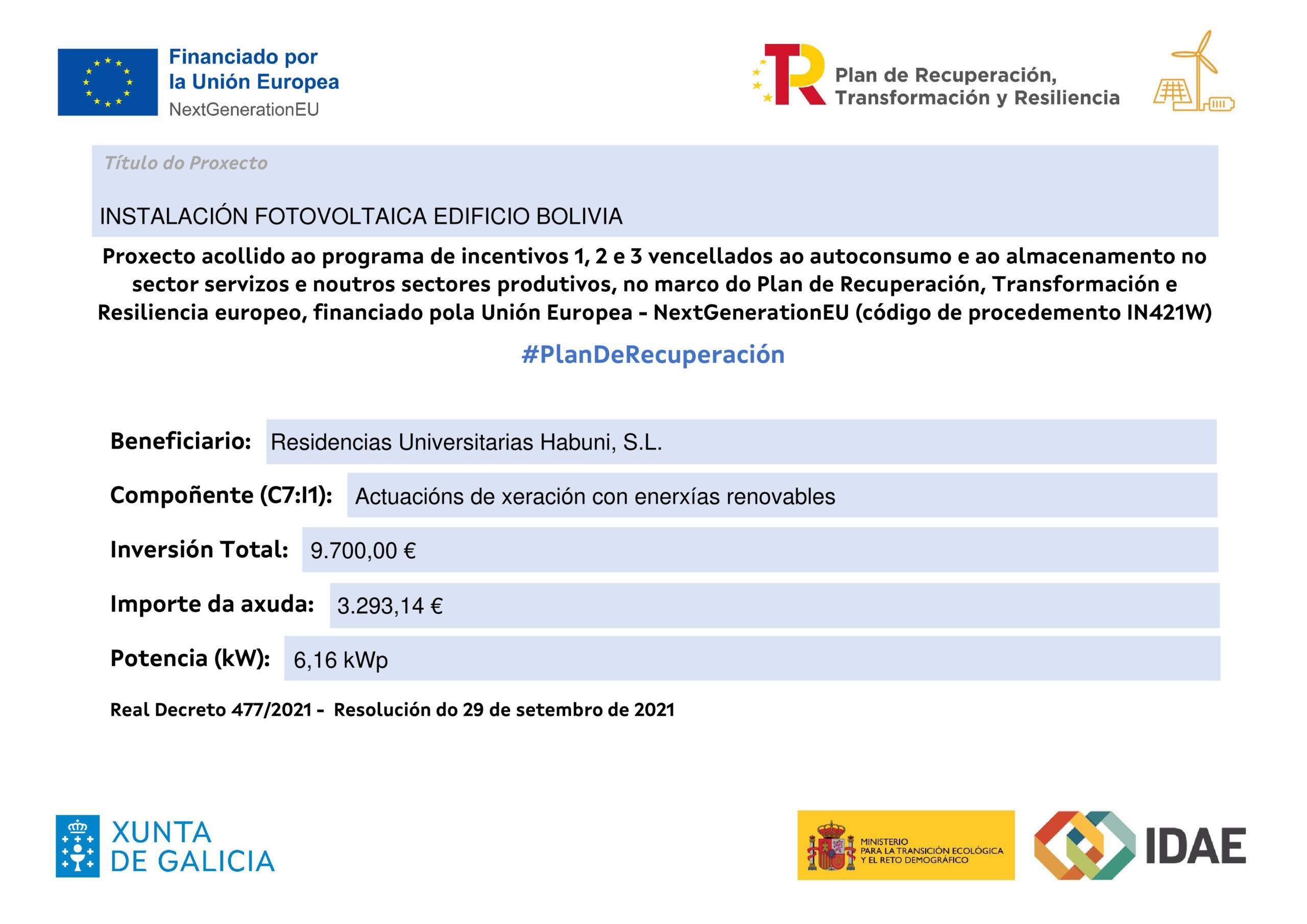 Residencias Universitarias Habuni es beneficiaria de una subvención del 45% del coste de la inversión realizada en el proyecto de energía fotovoltaica, que nos permite autoconsumir alrededor de un 30% de la electricidad necesaria para el correcto desarrollo de la actividad. Ayuda cofinanciada por la Unión Europea a través del Fondo Next Generation.